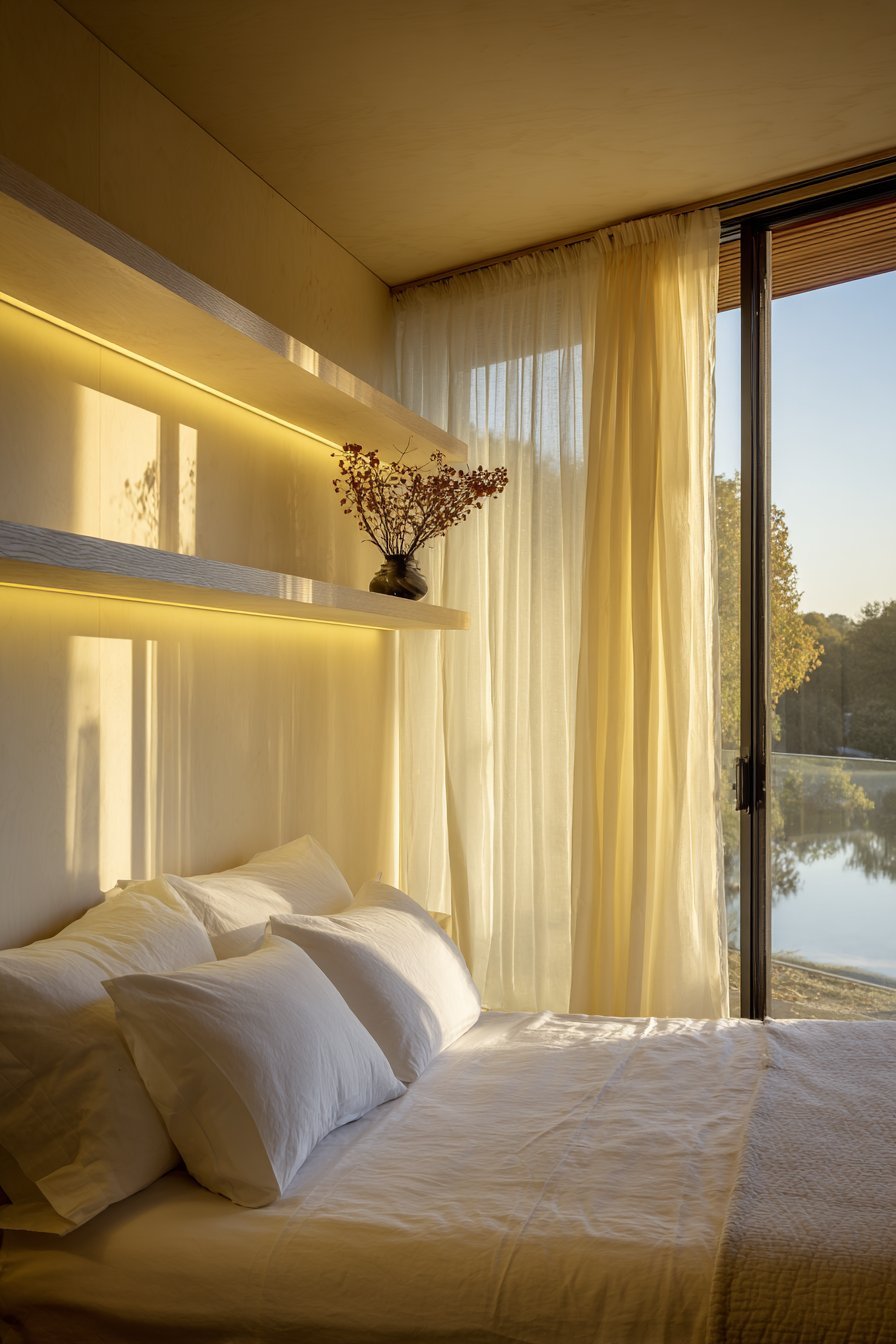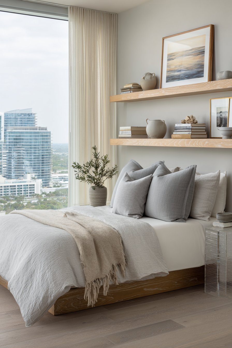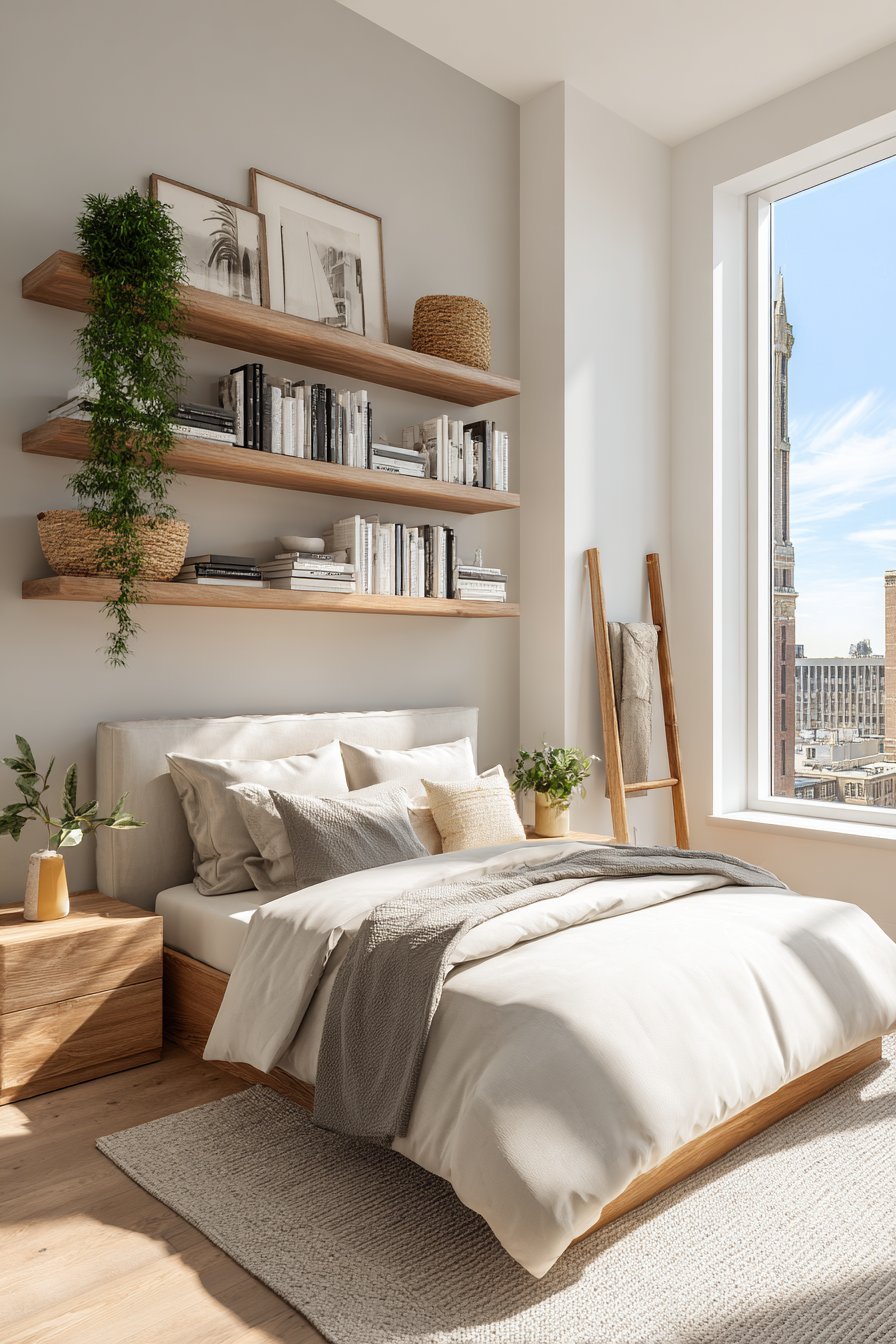- Mount floating shelves above the bed for books and decorative items