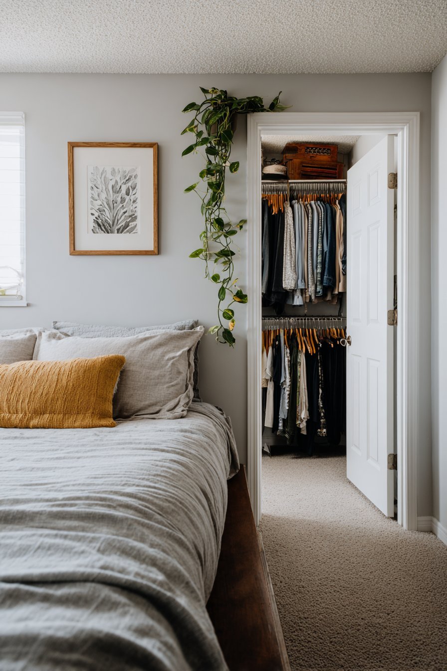 - Mount hooks inside closet doors for bags, scarves, and jewelry