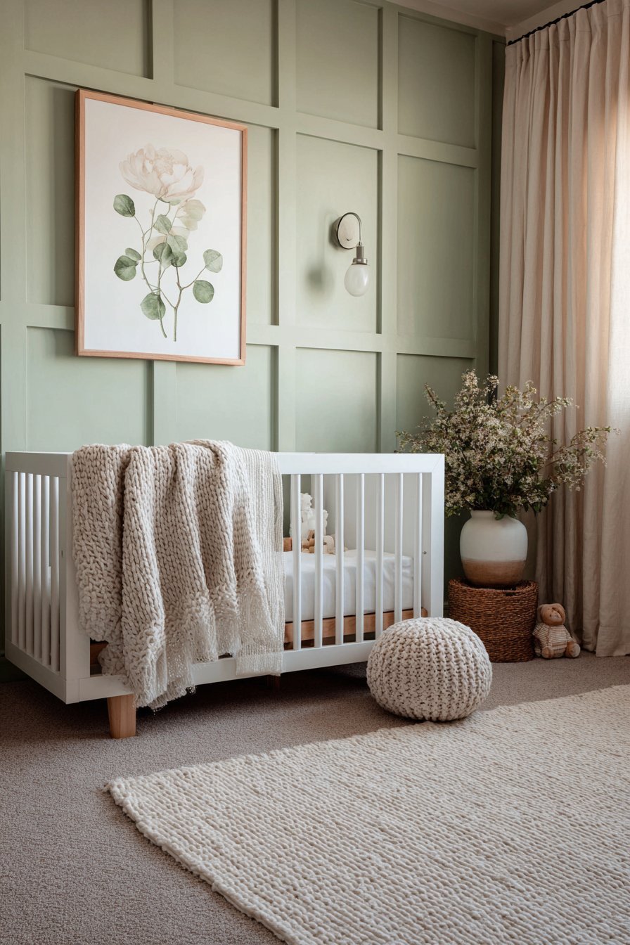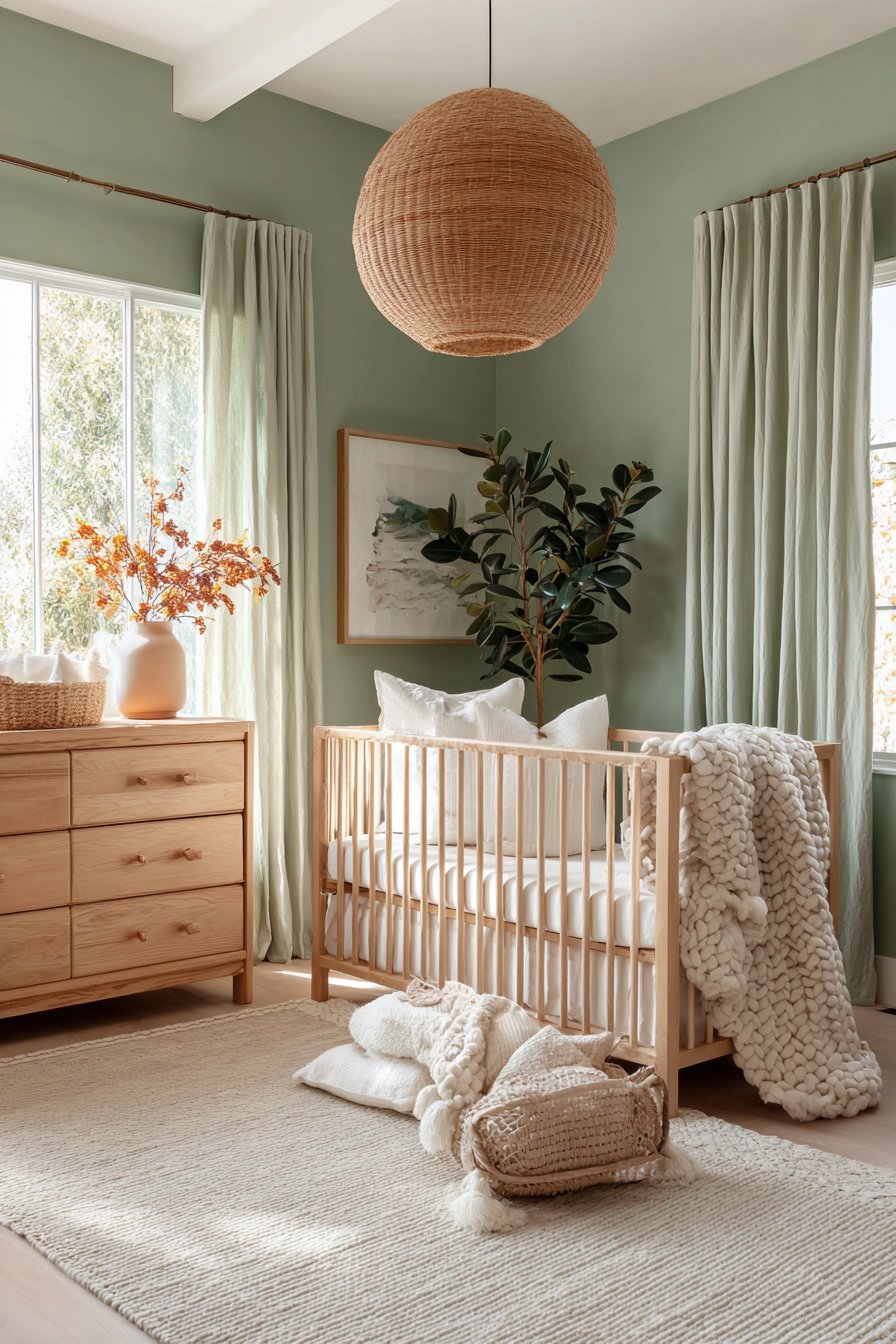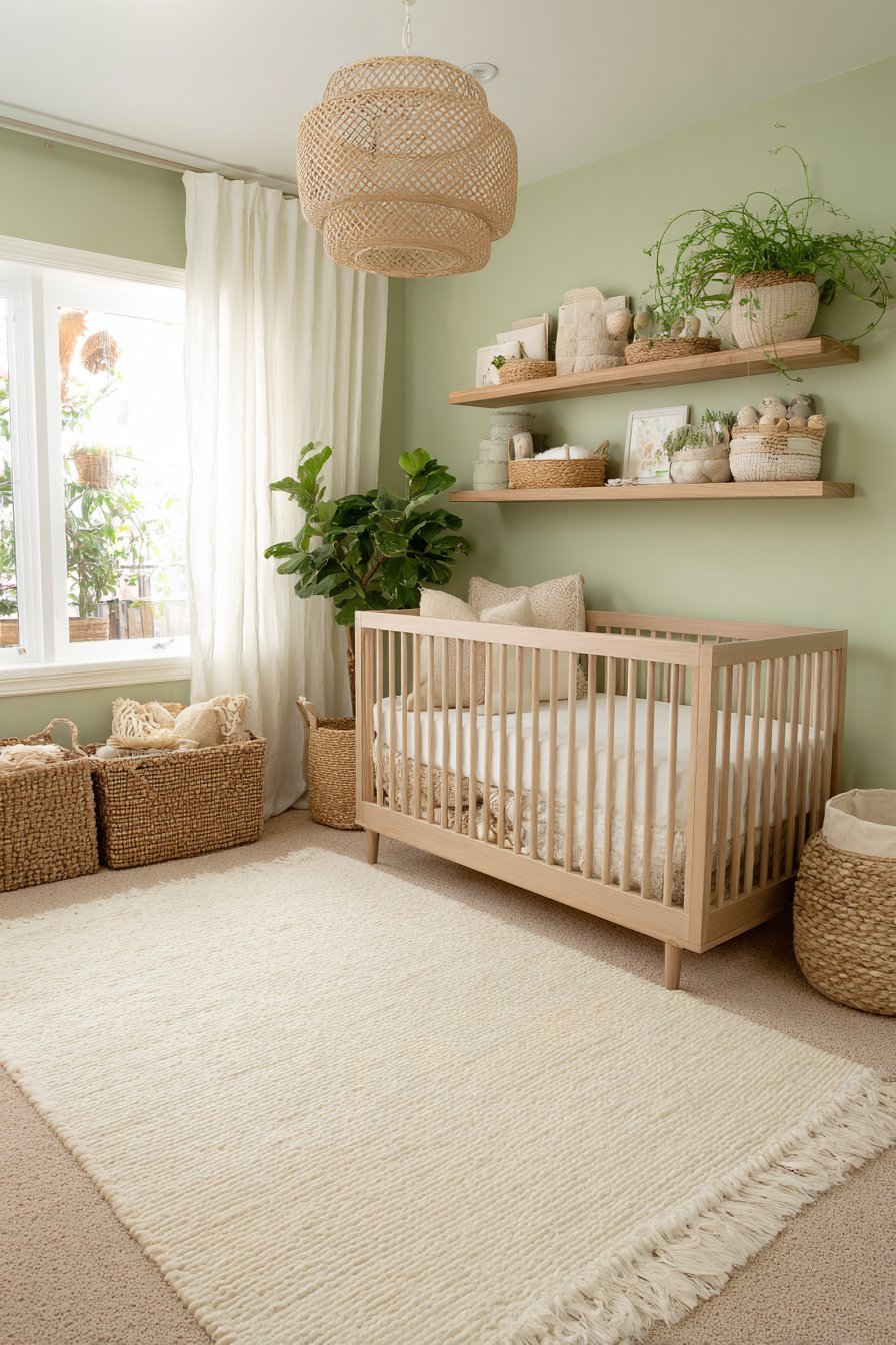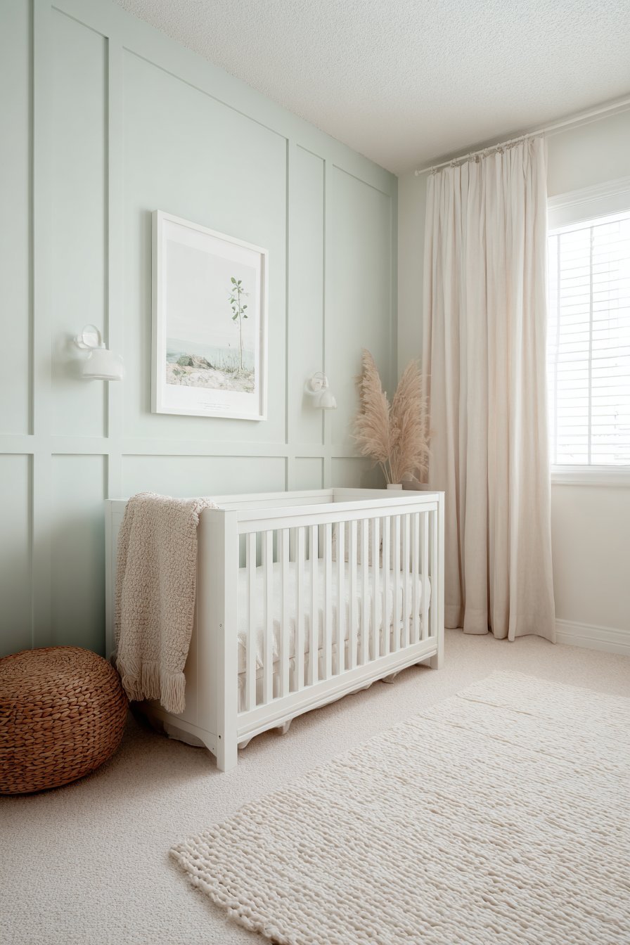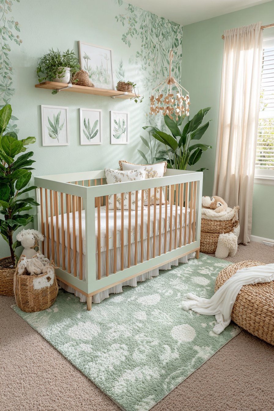 Mint green pairs beautifully with natural materials and organic textures that enhance nursery safety and sustainability. Wood furniture in light oak, maple, or birch creates warm contrast against mint green walls. Rattan baskets, jute rugs, and linen curtains add textural interest while maintaining the room’s peaceful atmosphere.
