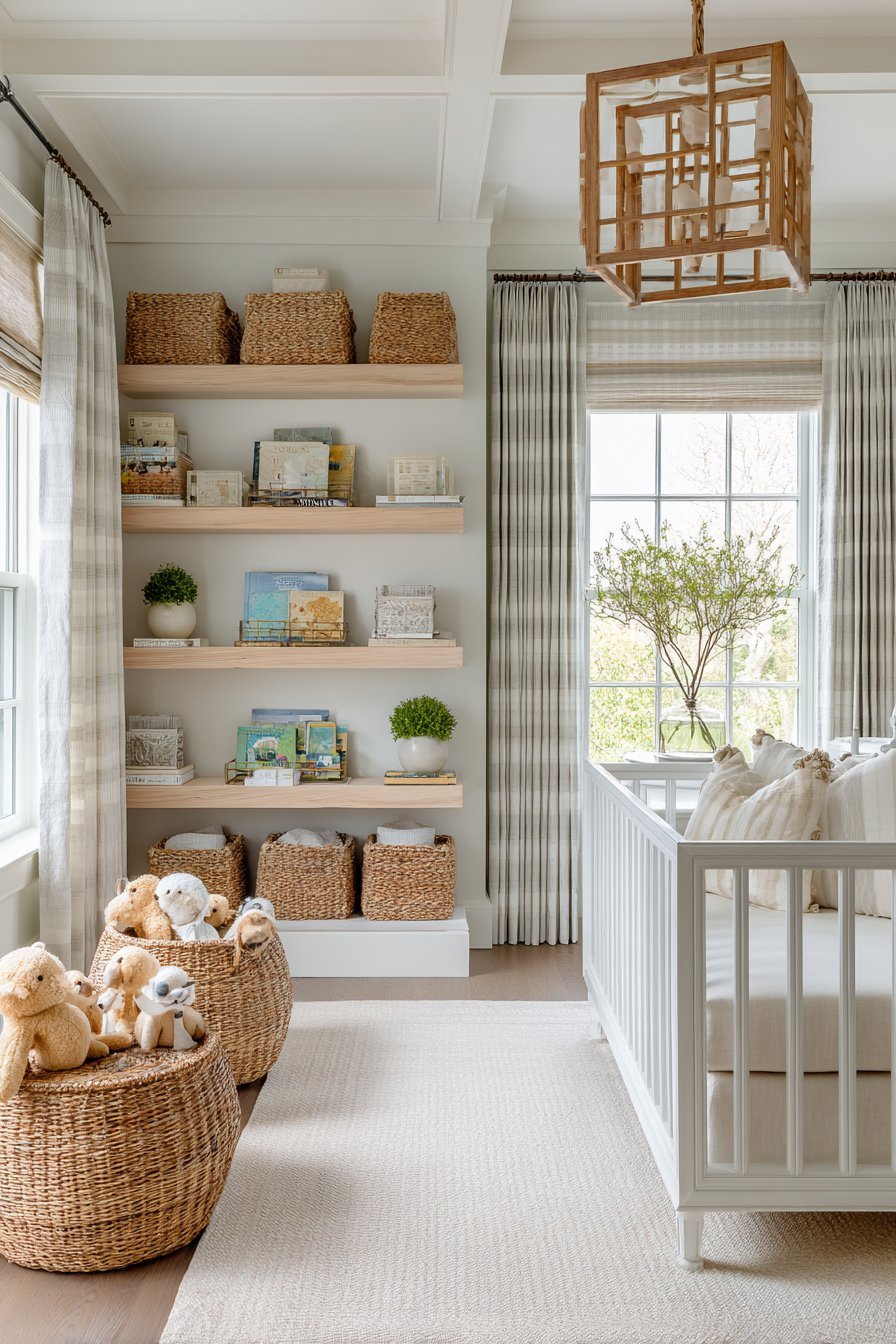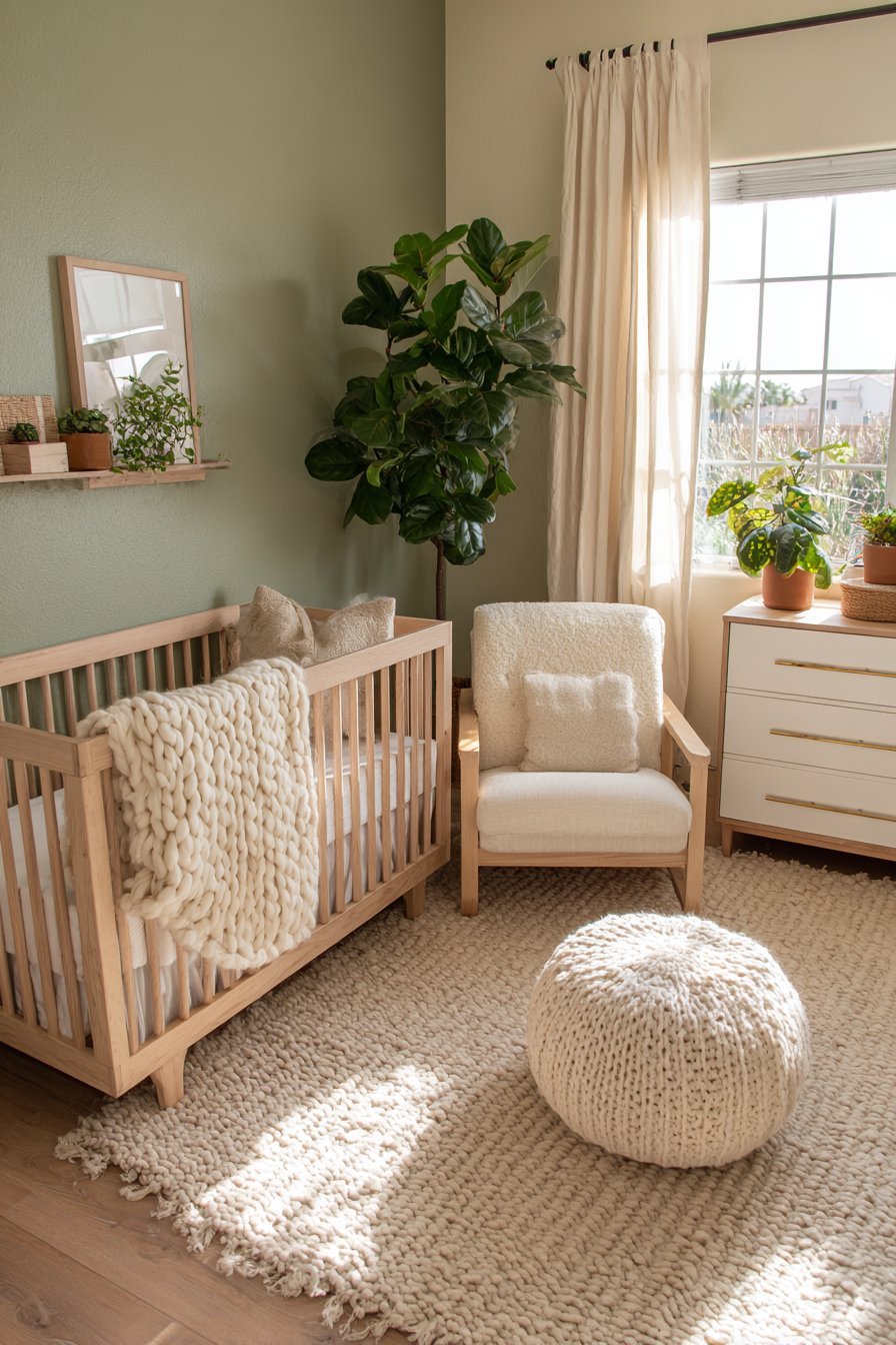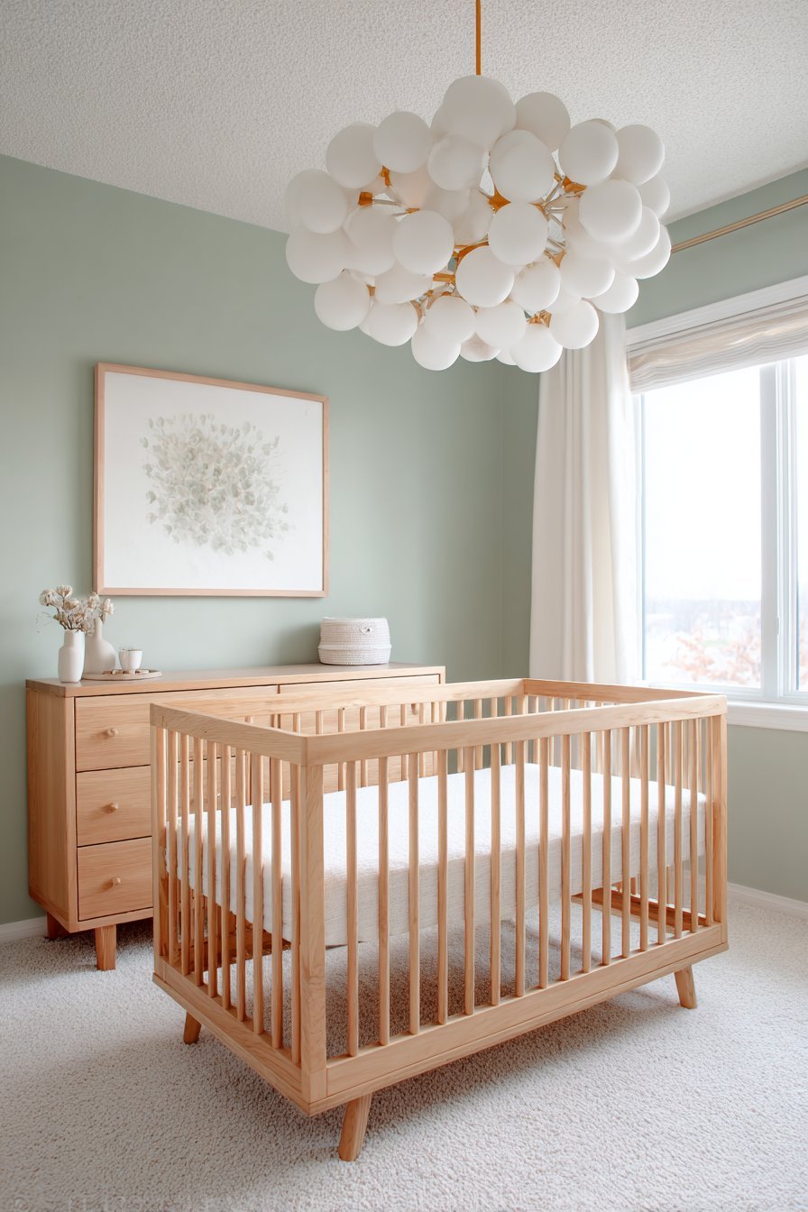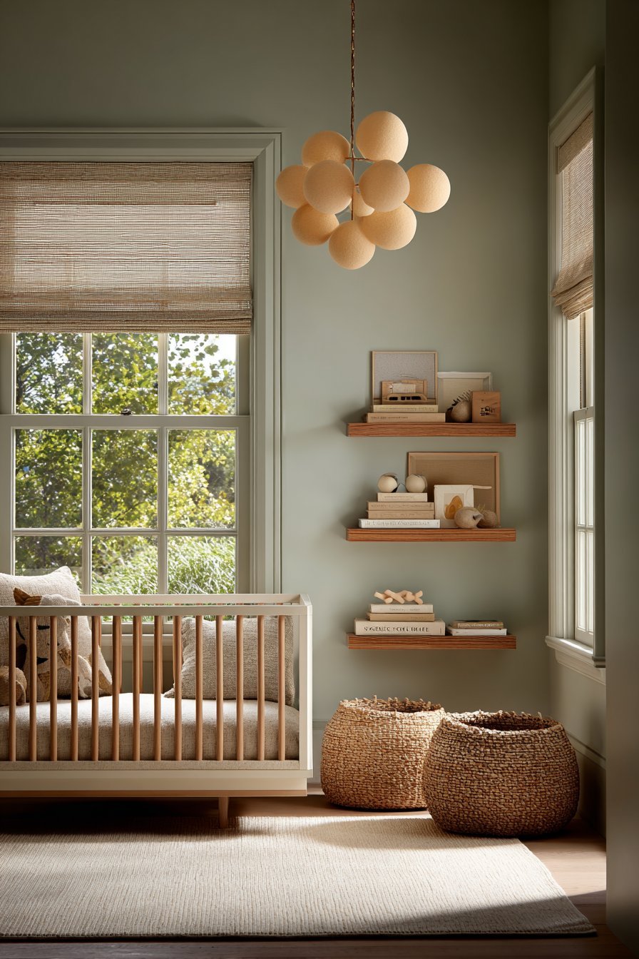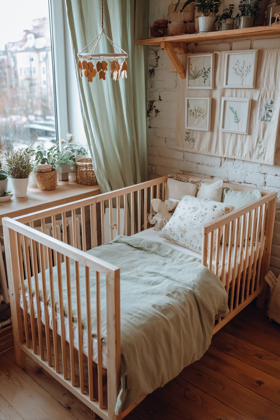 Mint green pairs beautifully with natural materials and organic textures that enhance nursery safety and sustainability. Wood furniture in light oak, maple, or birch creates warm contrast against mint green walls. Rattan baskets, jute rugs, and linen curtains add textural interest while maintaining the room’s peaceful atmosphere.