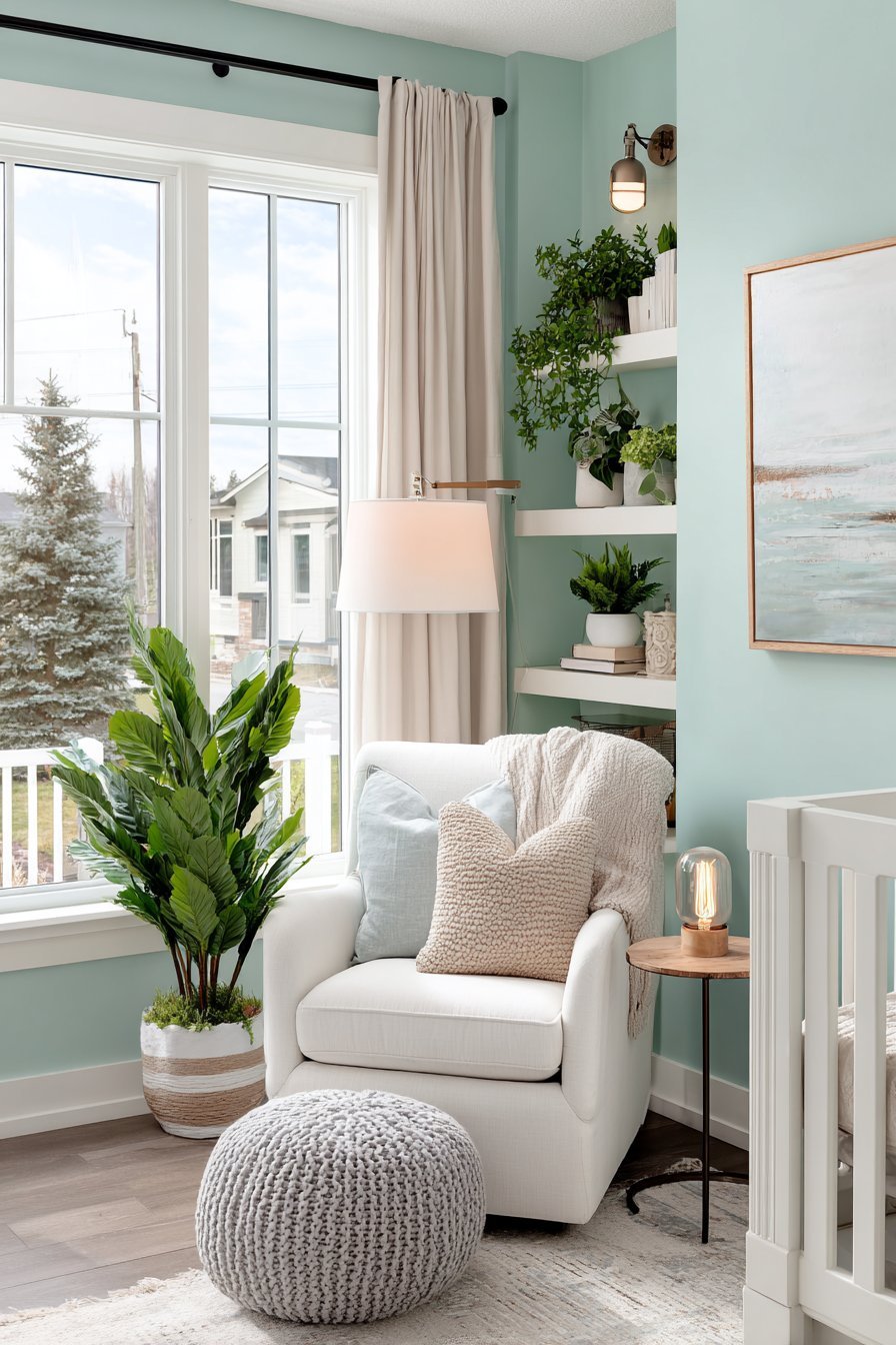 - Create a comfortable nursing or feeding corner in the mint green space for extended comfort