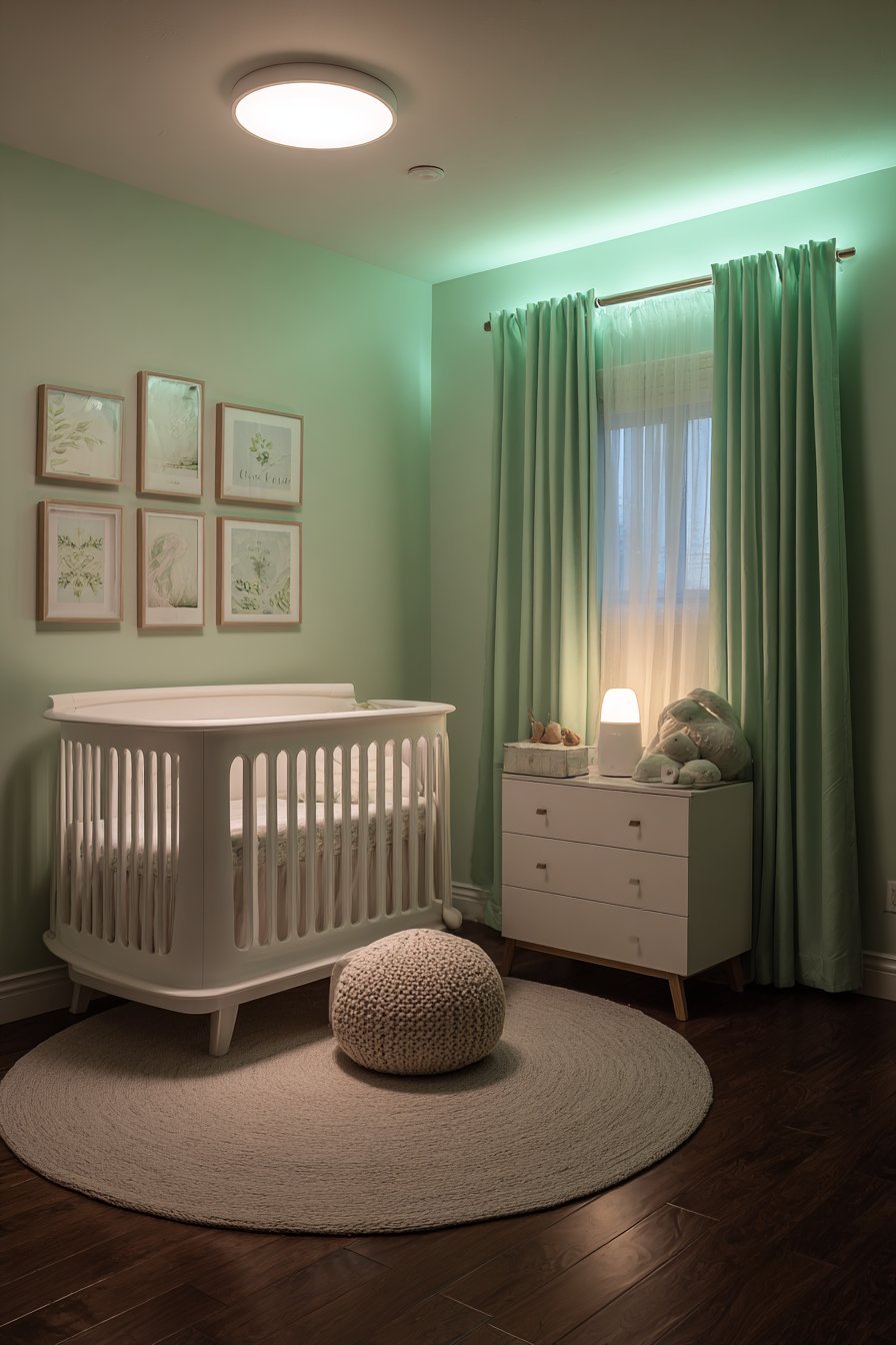 The reflective quality of mint green also enhances artificial lighting efficiency. During evening hours, lamps and fixtures provide adequate illumination without needing excessive wattage. This matters for energy efficiency and for avoiding overly bright lighting during nighttime feedings when you want to keep the baby drowsy enough to return to sleep easily.