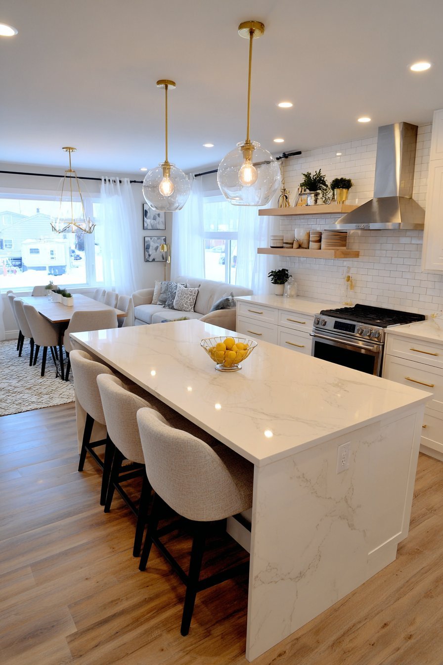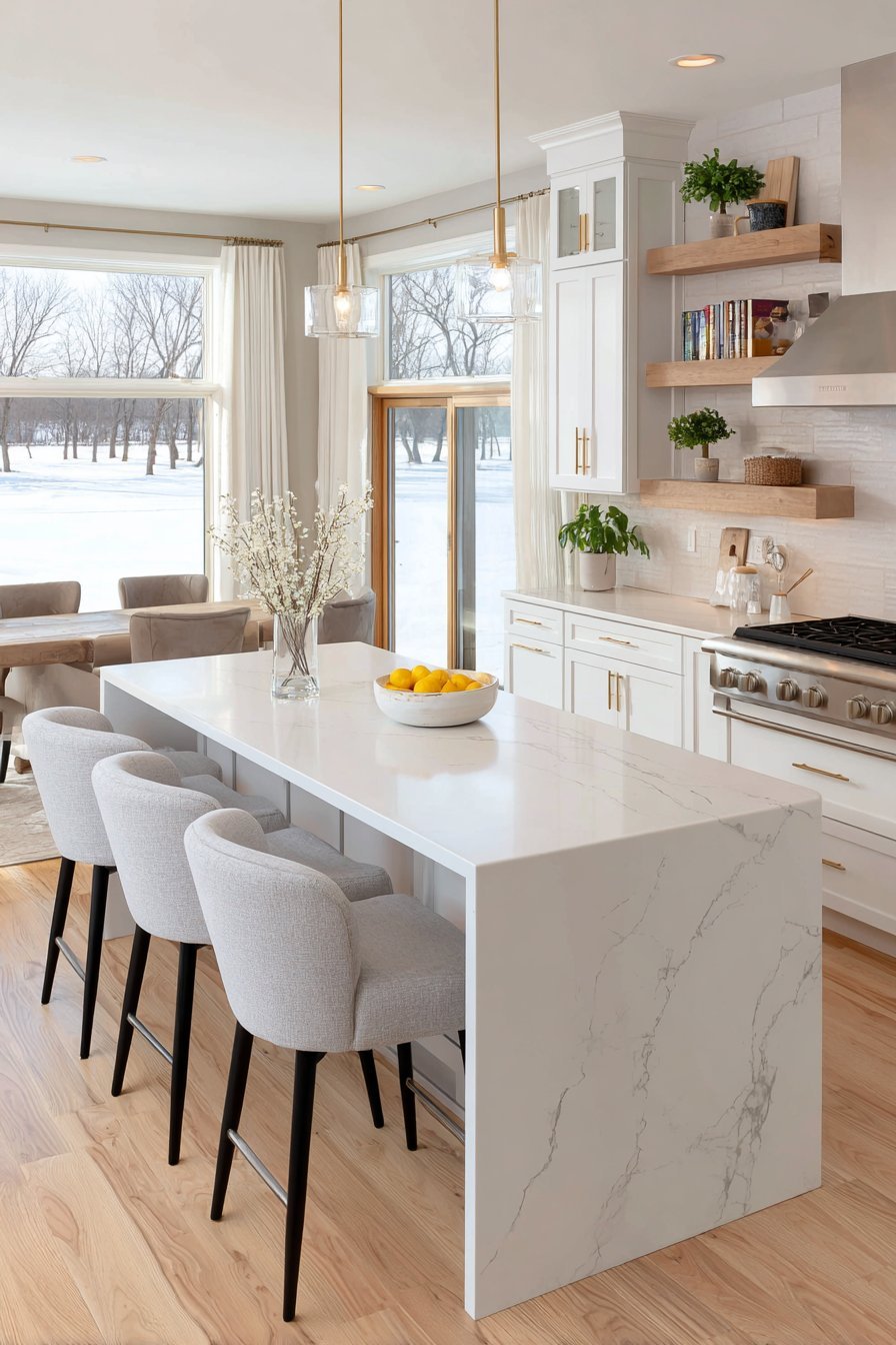 Picture a spacious open kitchen where a magnificent island commands attention. The waterfall edge quartz countertop flows elegantly to the floor. Subtle grey veining dances across the pristine white surface. Four modern bar stools provide comfortable seating for casual meals and conversations.