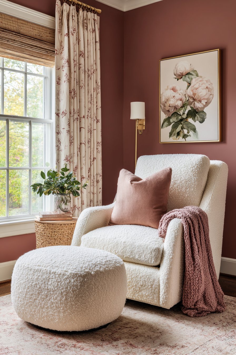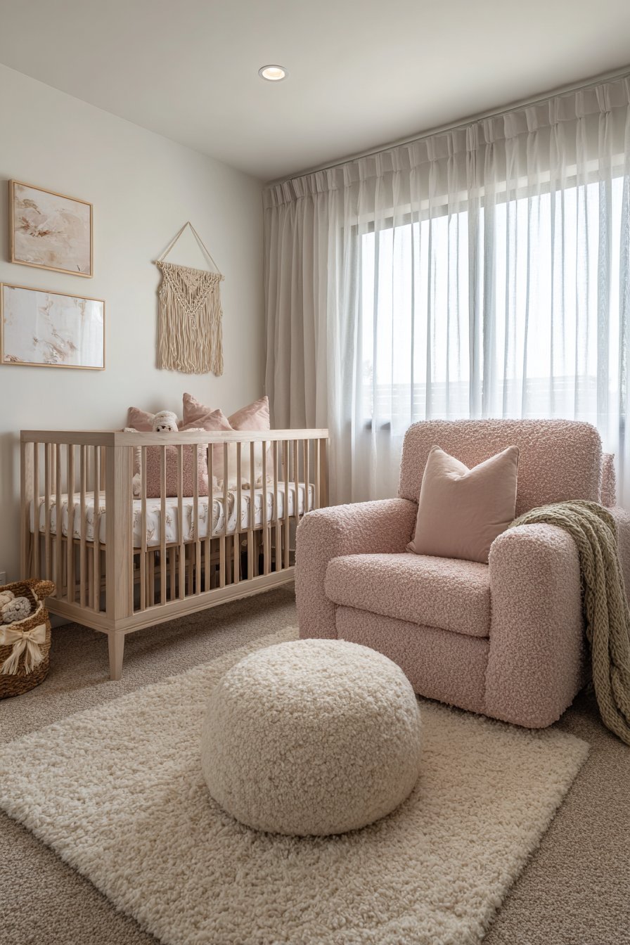 The nursing chair or glider is one of the most important textile investments in the entire nursery. Choose a chair with generous, supportive cushioning in a fabric that is both beautiful and practical — easy to wipe clean, resistant to moisture, and soft enough for prolonged nighttime feeding sessions. Bouclé, velvet, and performance linen are all excellent choices for a pink nursery — each adding a layer of tactile luxury while remaining within a calm, cohesive color palette. Position the nursing chair in a corner with good sightlines to the crib.