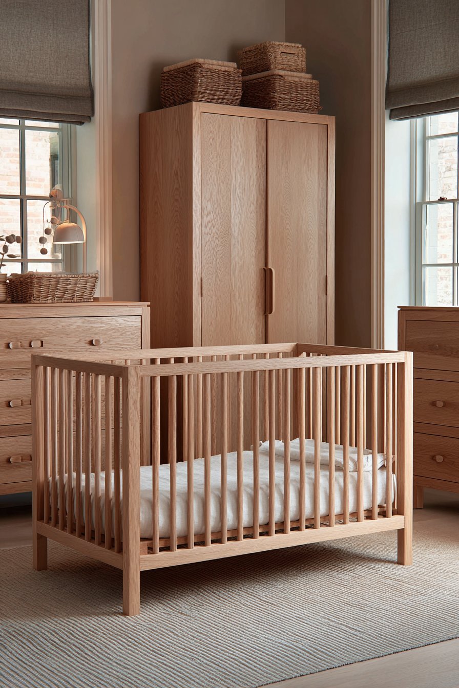 - Choose a crib in natural light oak, pale ash, or white-painted wood to complement pink tones