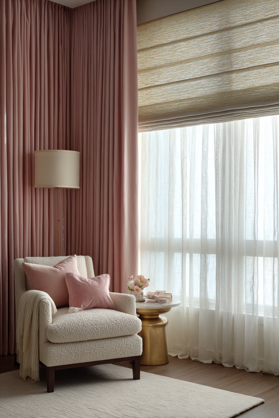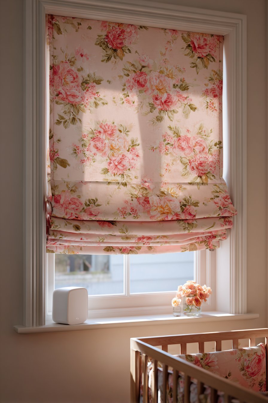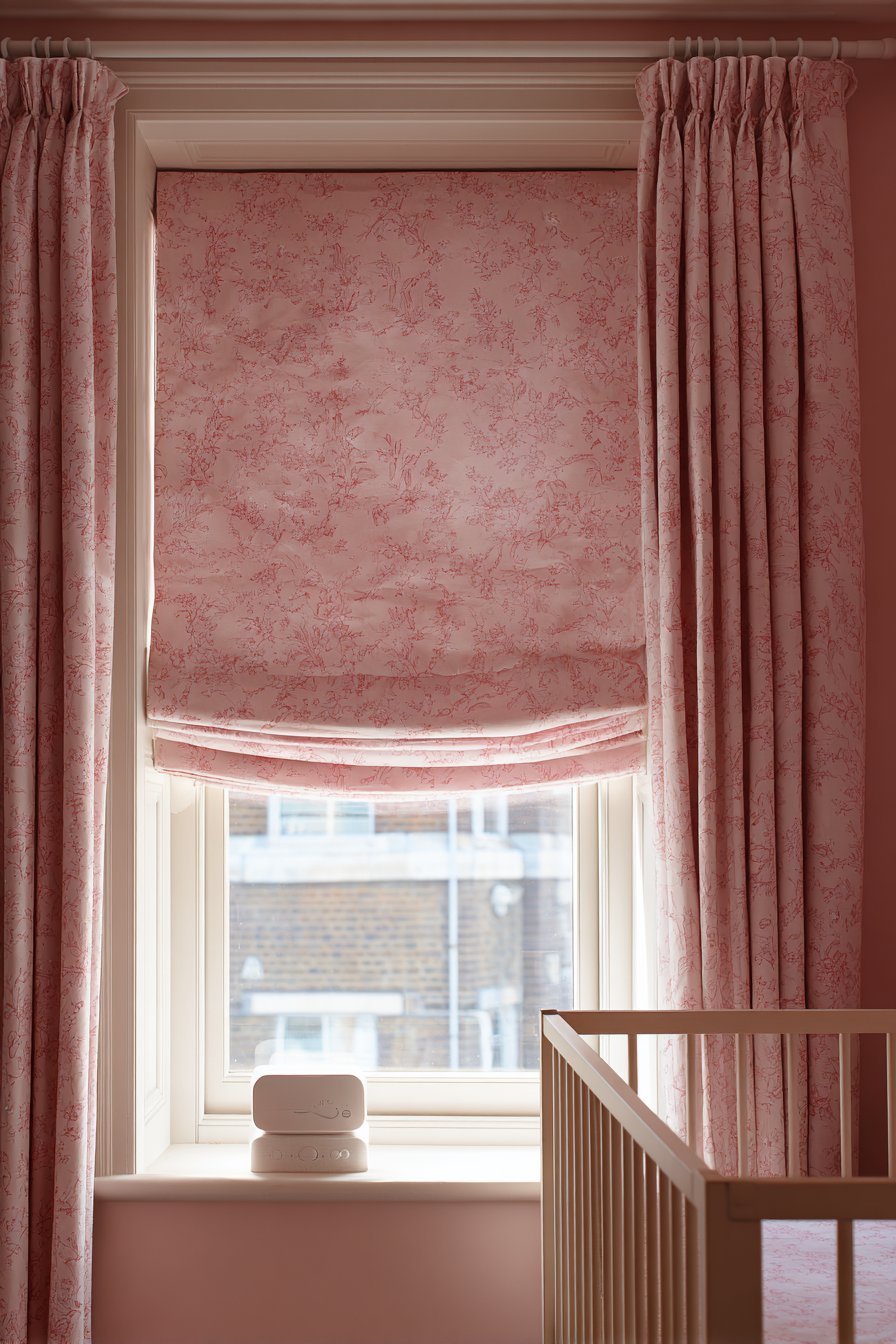 Blackout window treatments are essential in a nursery, not optional. In summer months, early sunrise can wake babies as early as 4 or 5 AM — far earlier than developmentally appropriate for infant sleep. Full blackout curtains or Roman blinds, fitted snugly within the window recess to eliminate light gaps at the sides and top, maintain a sleep-conducive darkness during all nap times and early morning hours. For a pink nursery, choose blackout curtains in a coordinating blush, warm white, or soft floral print that contributes to the room’s design rather than detracting from it.
