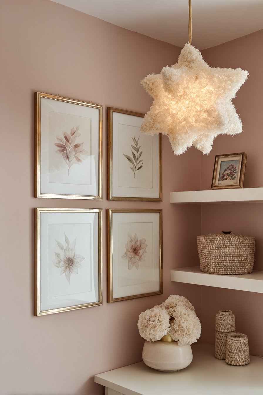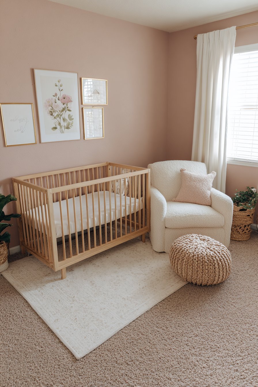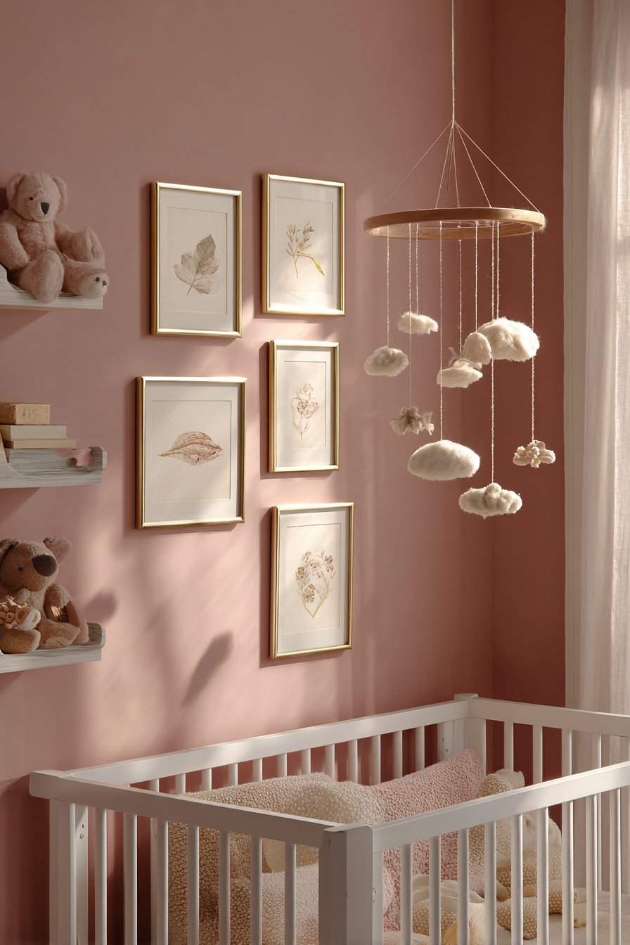 Wall art in a pink nursery should be soft, simple, and gentle in subject matter and color. Botanical prints in muted tones, simple animal illustrations, abstract watercolor washes, and hand-lettered affirmations all contribute a layer of visual warmth and meaning without introducing stimulation. Avoid high-contrast black and white graphic prints above the crib — while these engage newborn vision during wakeful times, they are counterproductive in the sleep space. Frame artwork in natural timber or thin brass to complement the pink palette without adding visual weight.
