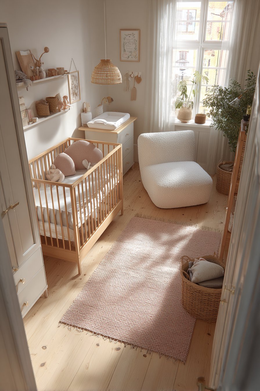 Layering the rug, cot bedding, window treatments, and wall textiles creates the multi-sensory richness that characterizes the most calming nursery environments. Choose a soft, low-pile rug in warm white, blush, or a subtle pattern that ties the palette together. Use blackout roman blinds or curtains in a coordinating linen or cotton as the primary window treatment, then layer with sheer panels for daytime filtering. Add a wall-hung textile — a woven tapestry, macramé, or embroidered piece — as a soft, sound-absorbing focal point above the crib.