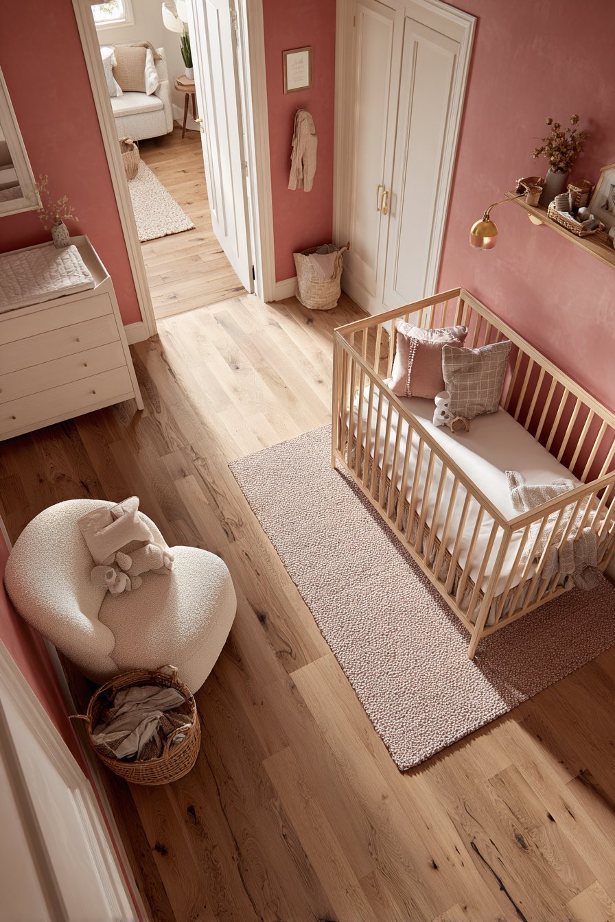 When selecting your pink, always test paint samples on the actual nursery walls in both natural and artificial light before committing. Pink is one of the most light-sensitive colors in the spectrum — a tone that appears warm and serene in the paint store can read as lilac in north-facing rooms or almost white in a sun-drenched space. Hold large sample patches against the room’s existing elements — flooring, trim, and furniture — and observe them at different times of day before making your final decision.