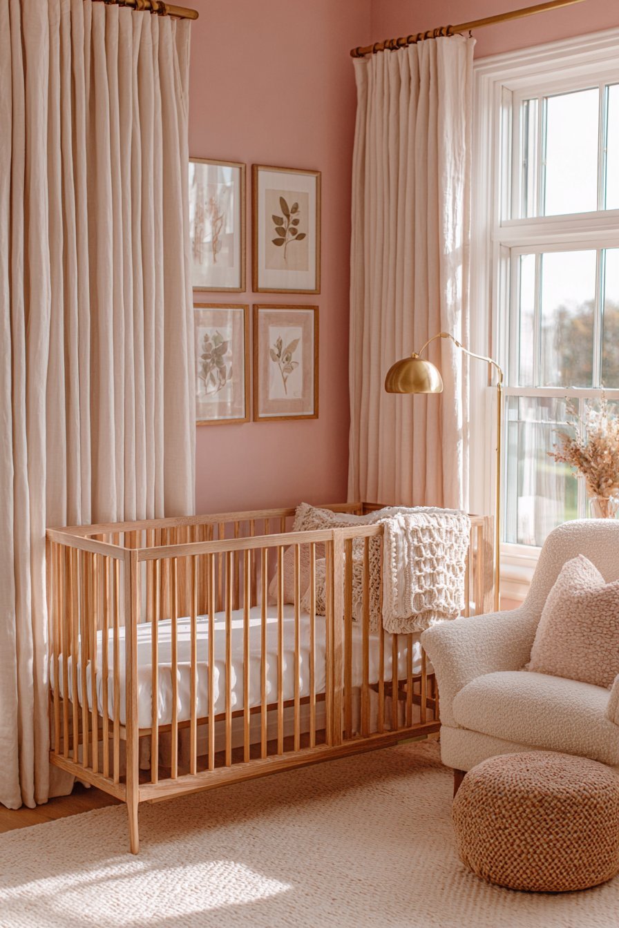 The crib is the functional heart of every nursery, and its design, placement, and quality have a direct impact on how safely and comfortably your baby sleeps. For a calming pink nursery, choose a crib that complements the room’s soft color palette without competing with it. Natural wood tones — light oak, pale ash, and warm maple — sit beautifully alongside blush and dusty rose, introducing an organic warmth that enhances the room’s nurturing atmosphere.