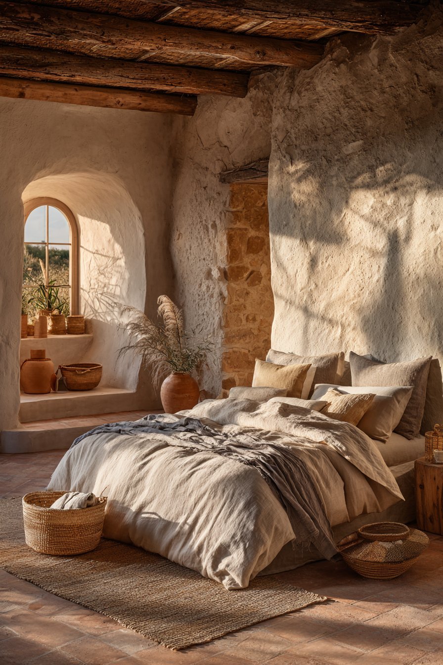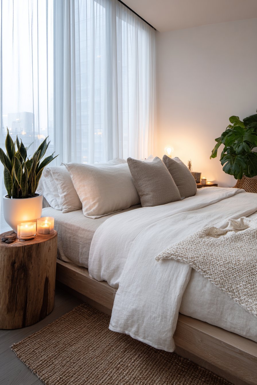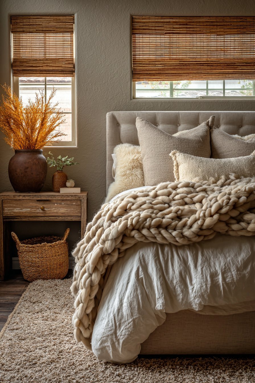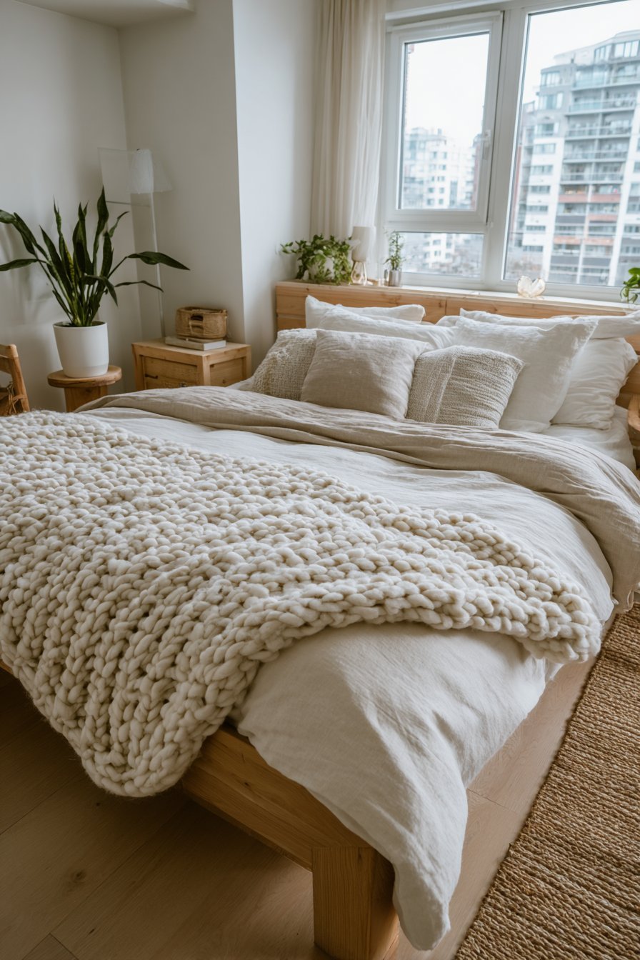 Start with linen bedding as your foundational texture, offering both comfort and visual softness. Add a chunky knit throw blanket in cream or oatmeal for cozy dimension. Consider a jute or sisal rug to ground the space with earthy texture underfoot. These natural fibers create warmth without overwhelming the senses.