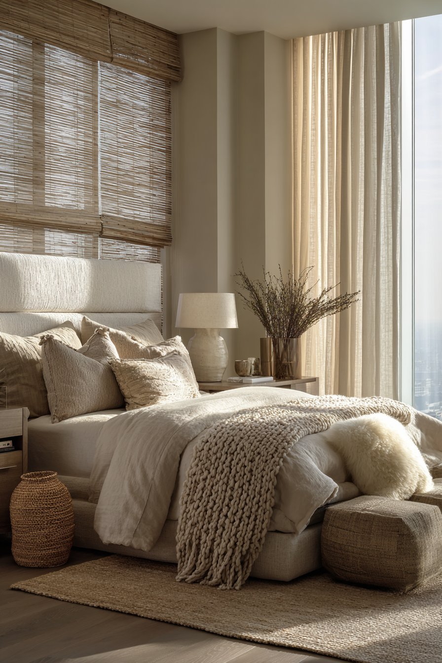Window treatments provide excellent opportunities for textural layering. Combine sheer white curtains with heavier linen or cotton panels in beige. This layering offers both light control and visual depth. Woven bamboo shades add another natural texture while providing functional privacy and light filtering.