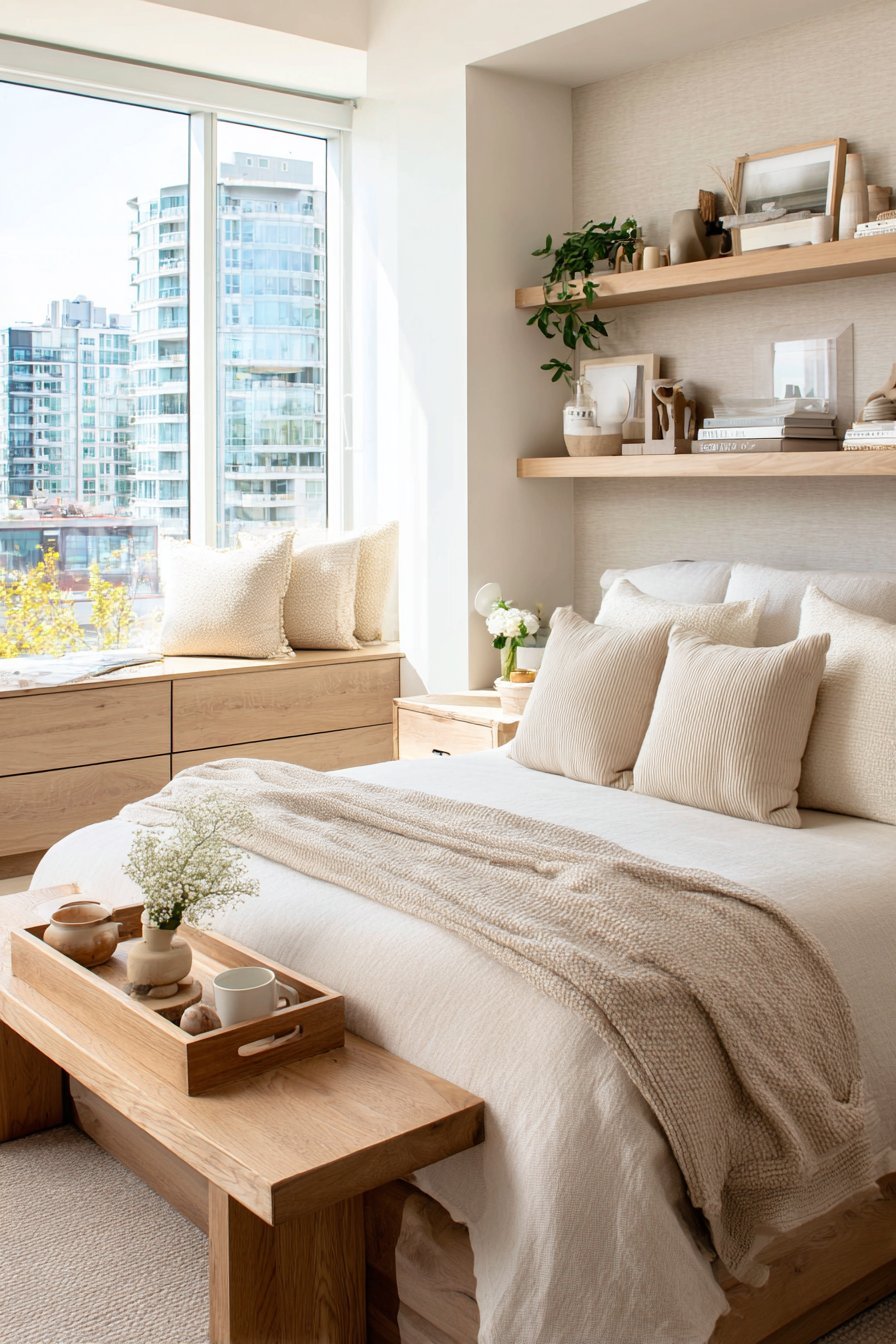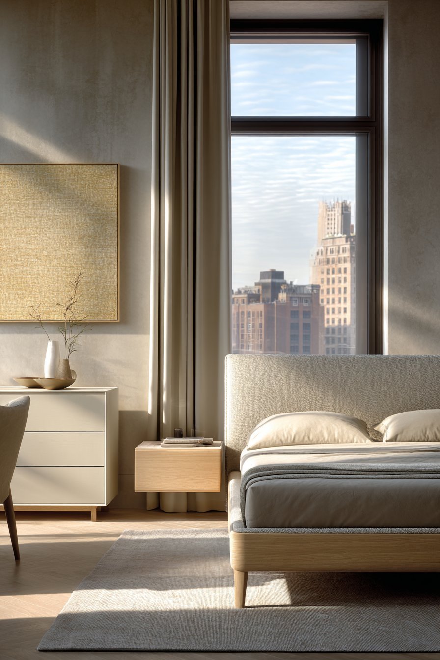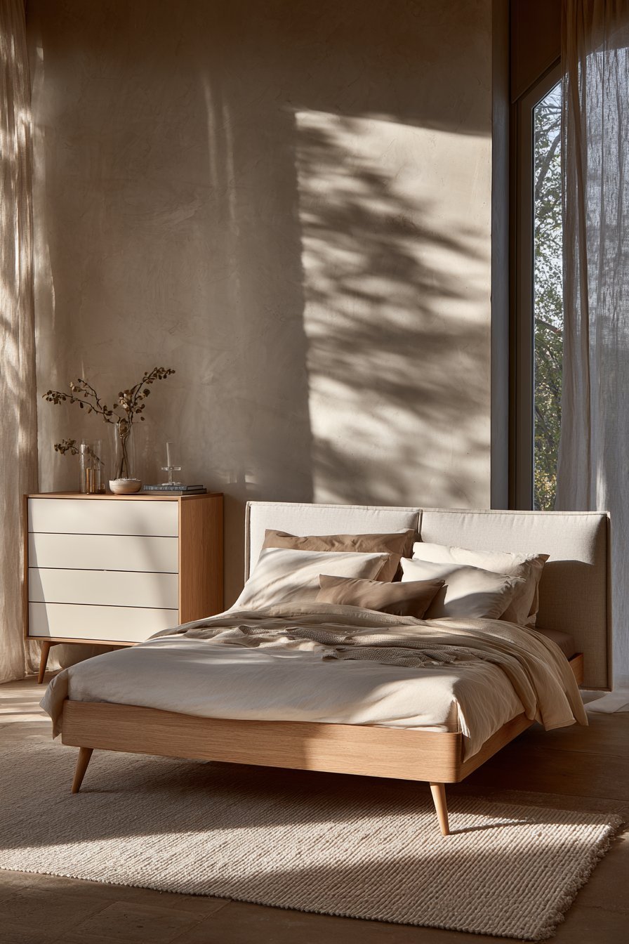 A low-profile platform bed in light wood or upholstered in beige linen becomes the room’s focal point. This style keeps sight lines open and creates a grounded, peaceful feeling. Avoid tall, heavy headboards that dominate the space. Instead, opt for something simple that complements rather than commands attention.