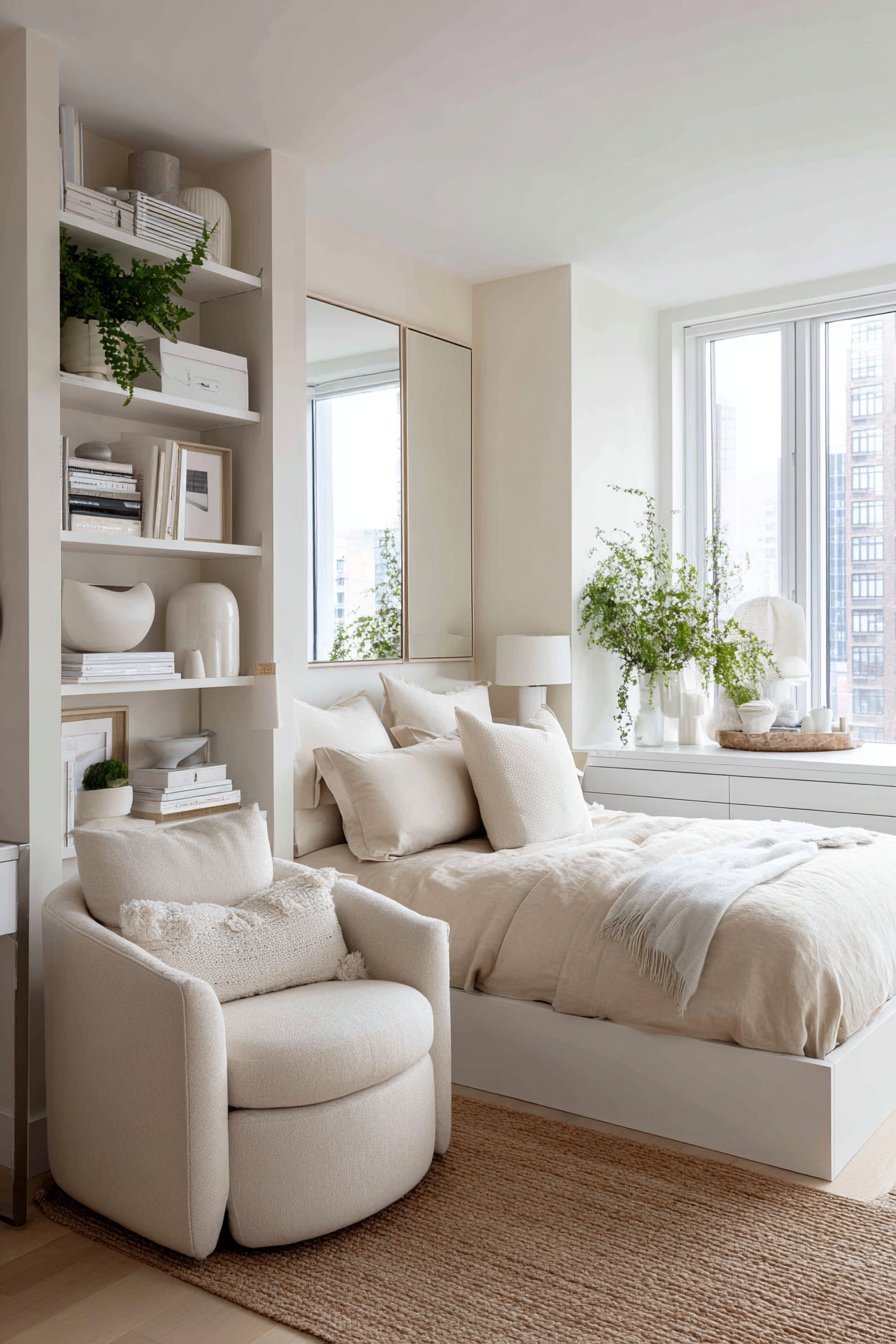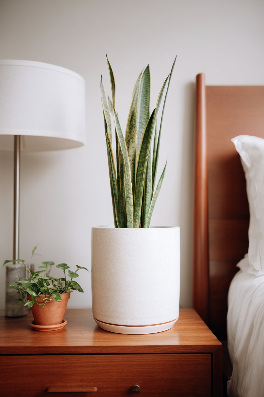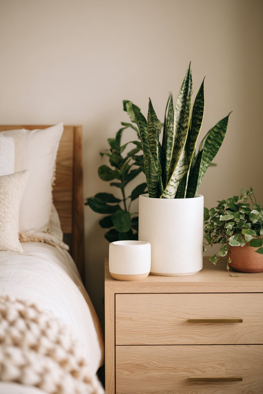 Snake plants and pothos thrive in various light conditions and require minimal maintenance. Their simple forms and muted green tones complement white and beige beautifully. Place larger plants on the floor in corners and smaller ones on nightstands or dressers. Keep arrangements simple—one to three plants maximum.