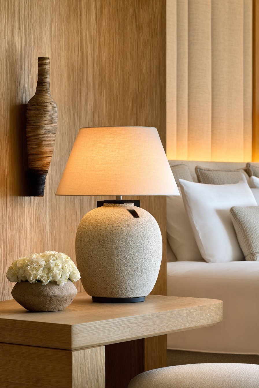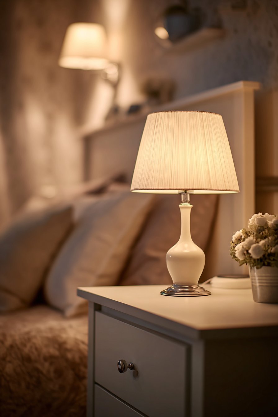 Bedside table lamps with warm bulbs (2700K-3000K) provide essential task lighting for reading. Choose lamps with simple ceramic or linen bases in white or beige. Avoid ornate bases or colorful shades. Consider cordless rechargeable lamps to eliminate unsightly cords and create cleaner sight lines.