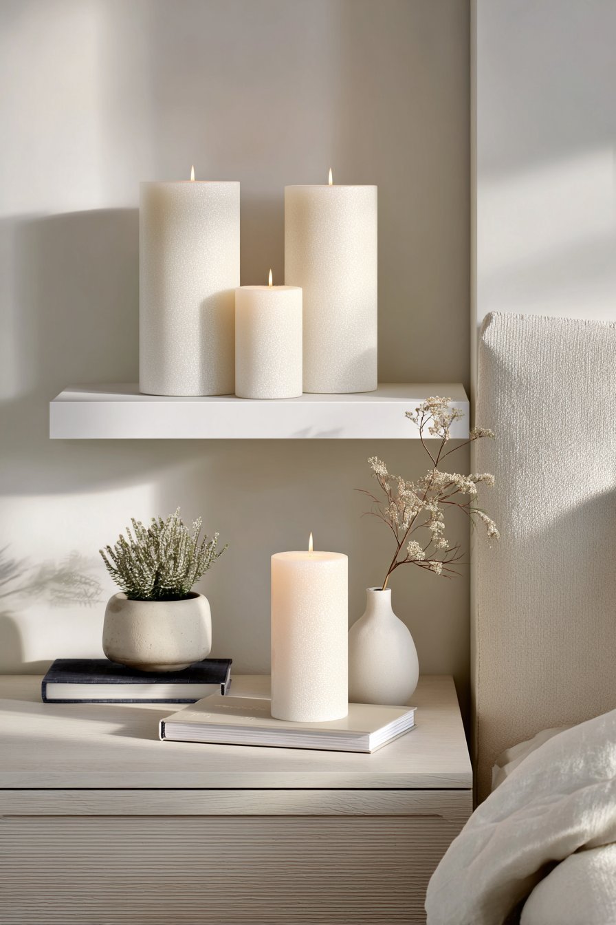 Follow the “rule of three” for surface styling—group items in odd numbers for visual balance. A nightstand might hold a lamp, small plant, and single book. Your dresser could display three varying-height white candles. This restrained approach maintains interest without creating clutter or competing focal points.