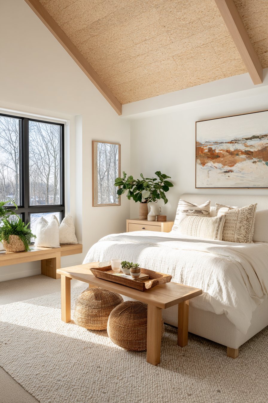 A wooden bench at the foot of your bed serves both function and form. Choose one in natural finish without paint or heavy stain. This piece offers seating, storage, and adds a horizontal line that grounds the space. Keep the design simple—straight lines and minimal ornamentation work best.