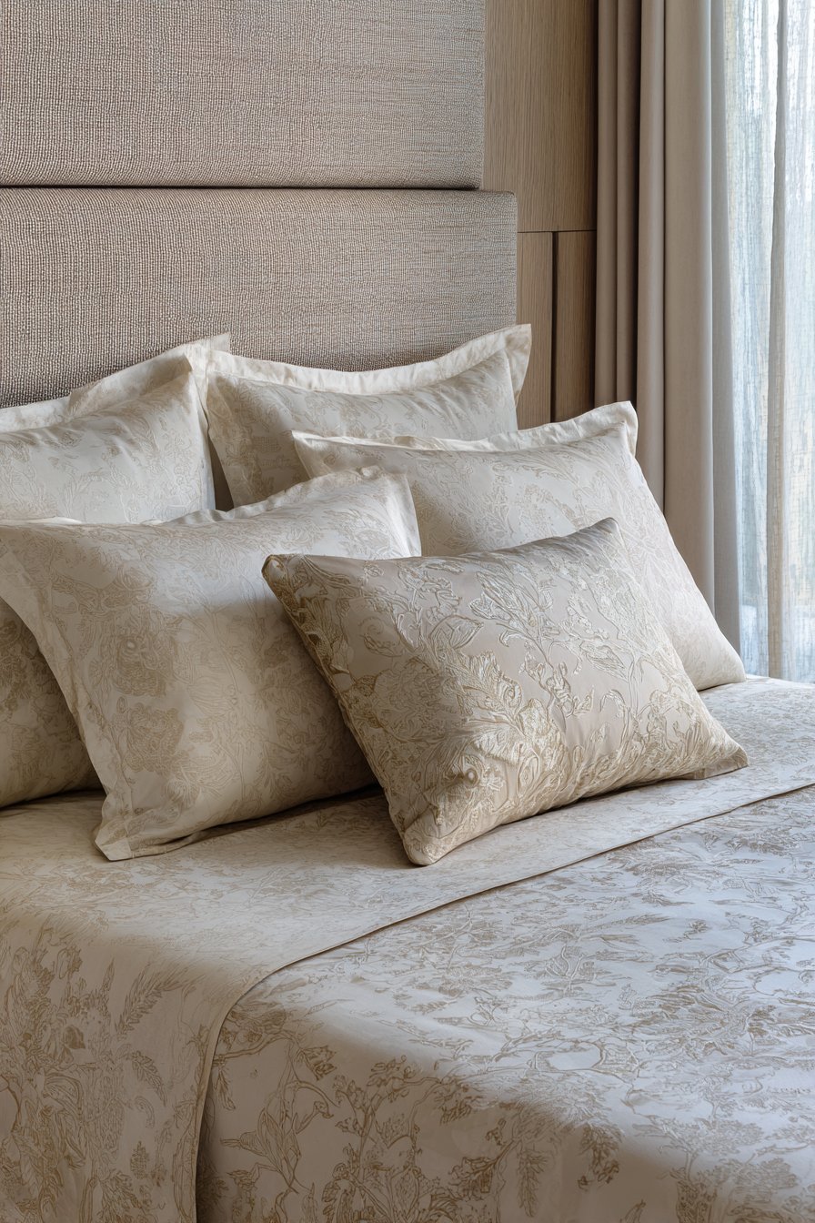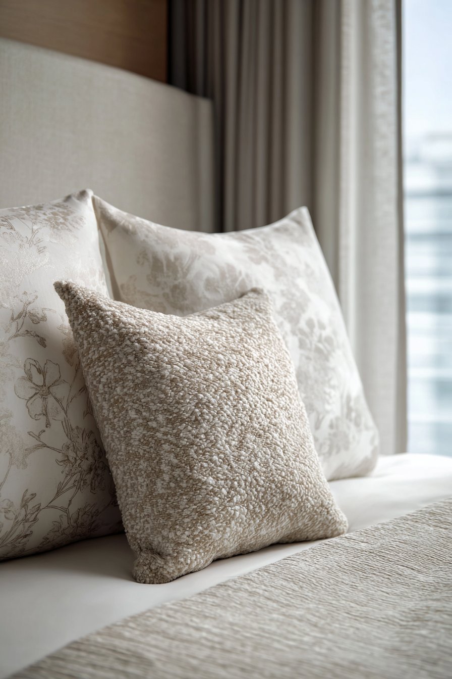 Tone-on-tone patterns maintain calm while adding depth to your design. A beige-on-cream floral bedding pattern or subtle stripe creates interest without introducing new colors. These patterns read almost as texture from a distance, becoming noticeable only upon closer inspection. This subtlety preserves the restful quality of your space.